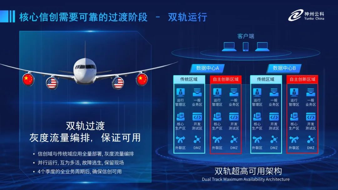 为帮助客户更好地应对数字经济时代对应用可持续性的高要求,实现信创与数字化兼得,kaiyun开云电竞推出了双轨超高可用架构。双轨超高可用架构在双活数据中心的分区调度基础上,增加信创域和非信创域的分域调度,实行信创域与传统域应用全量部署,使双中心运营变为双中心四区域并行运行,互为多活,将传统架构变为分区分域协同的多活双轨超高可用架构。帮助客户在新架构下,保障“信创”的同时解决性能瓶颈,提升稳定性,保证应用可持续性,最终实现信创区域和非信创区域的平滑过渡,完成国产化替代目标。”
